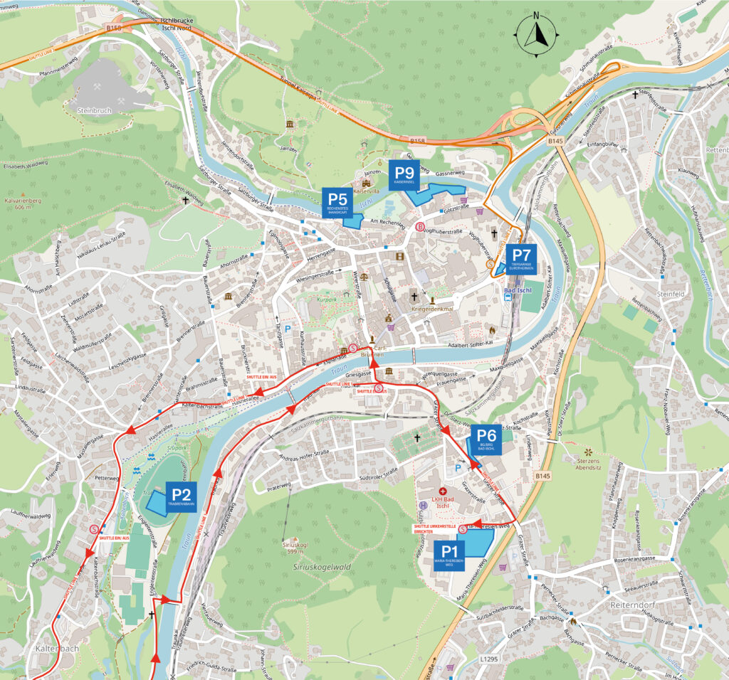 Folgende Parkplätze werden am 20. Jänner 2024 (offizielle Eröffnung) in und um Bad Ischl zur Verfügung gestellt und mit einem Parkplatz-Shuttleservice (2 Linien) serviciert.