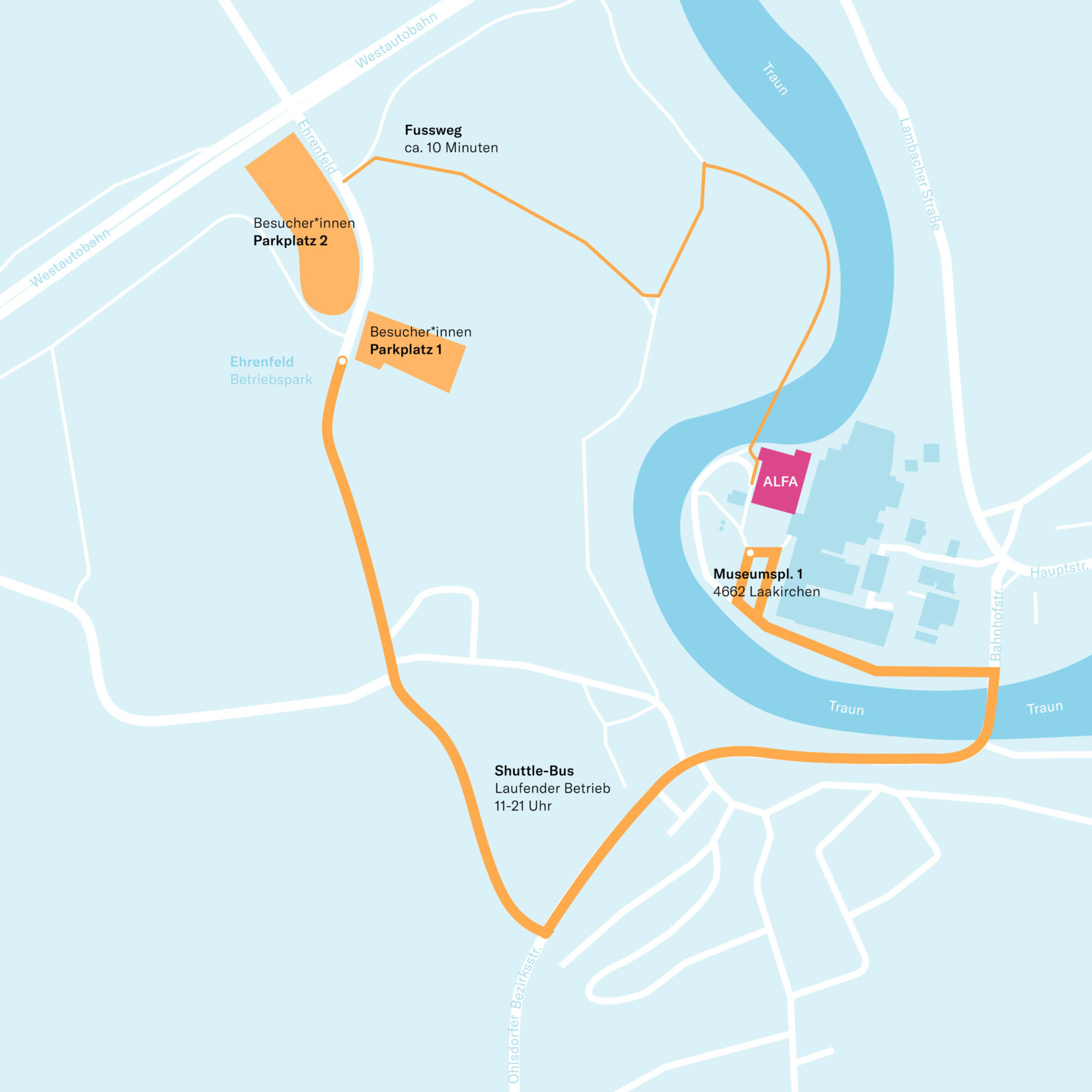 Wenn Sie dennoch mit dem Auto nach Laakirchen anreisen, beachten Sie bitte, dass am Samstag 30/11 keine Parkplätze am Veranstaltungsareal verfügbar sind. Ein kostenloser Shuttlebus fährt von 11:00 bis 21:00 Uhr vom kostenlosen Parkplatz beim REWE Zentrallager West (Betriebspark Ehrenfeld 4, 4694 Ohlsdorf → google maps) zum Veranstaltungsort ALFA in Laakirchen.