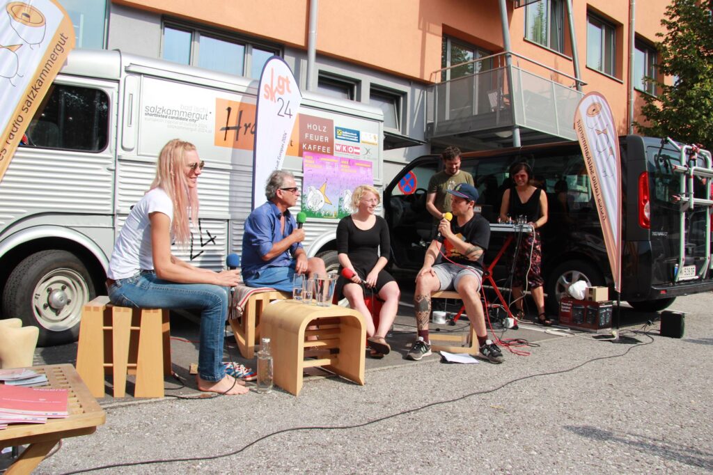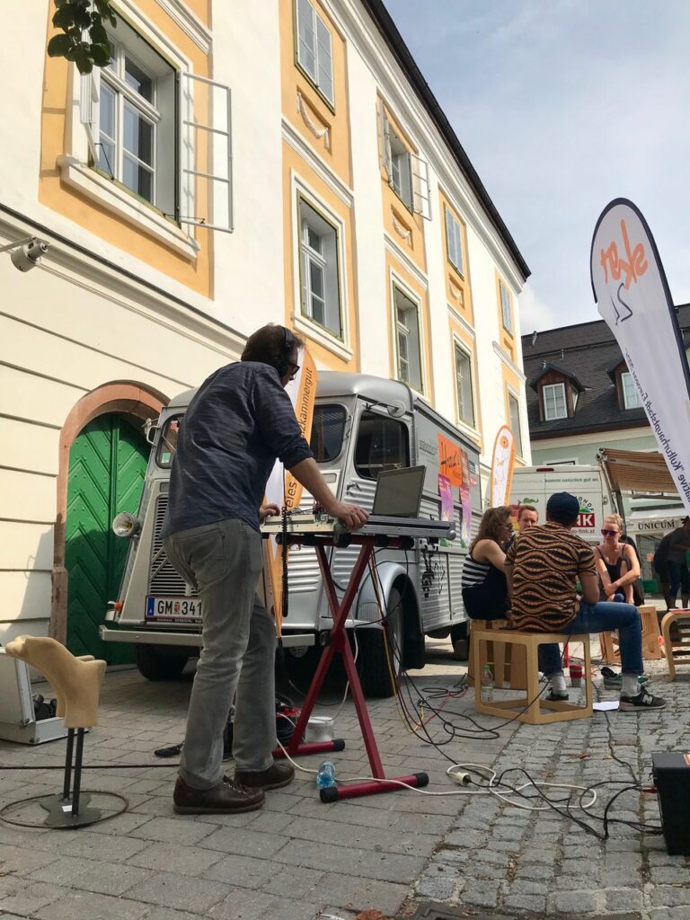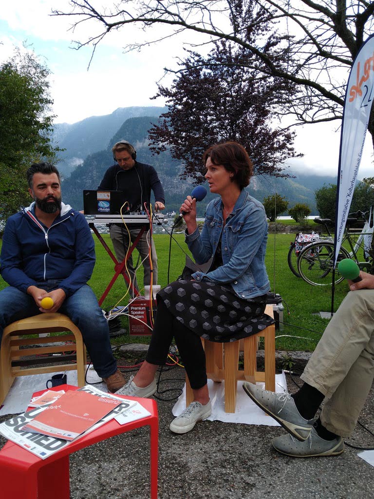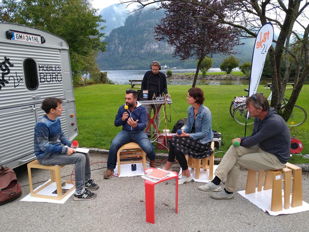 Einen Teil unserer Mobile Office Tour haben wir mit dem Freies Radio Salzkammergut gestaltet. Gemeinsam fuhren wir auf die Wochenmärkte der Region, um dort mit wechselnden Gästen über ortsspezifische Themen zu diskutieren. Die Gespräche würden live im Radio übertragen und boten für Passant*innen die Möglichkeit, Kommentare oder Fragen an die Runde zu adressieren.