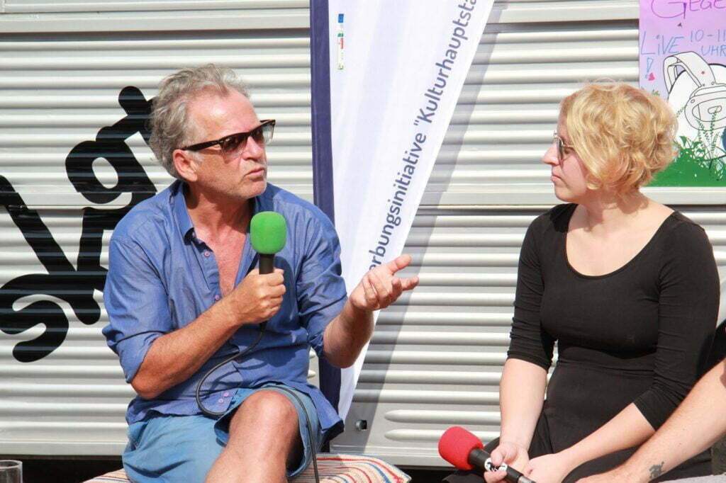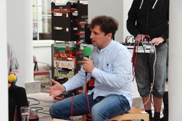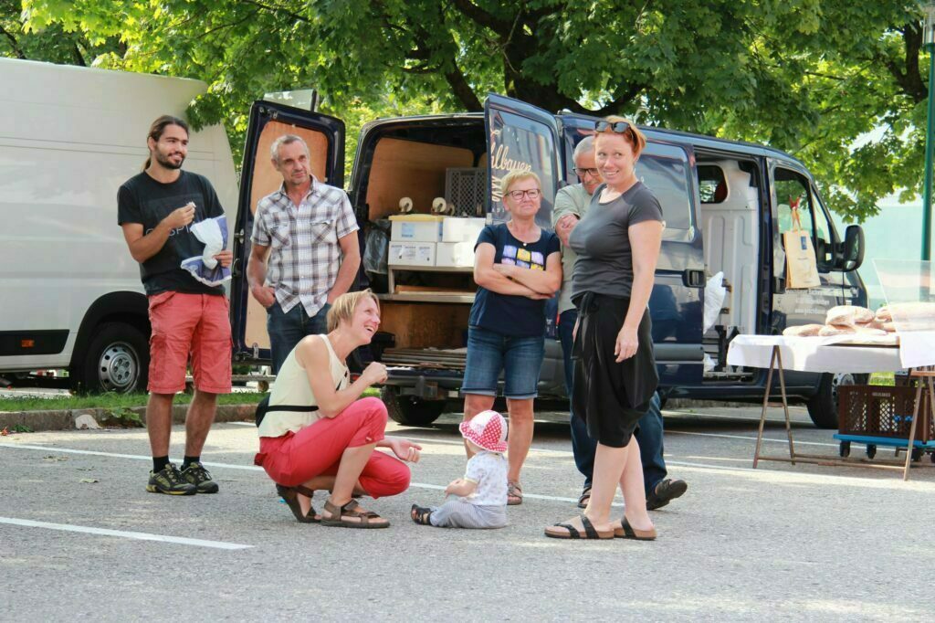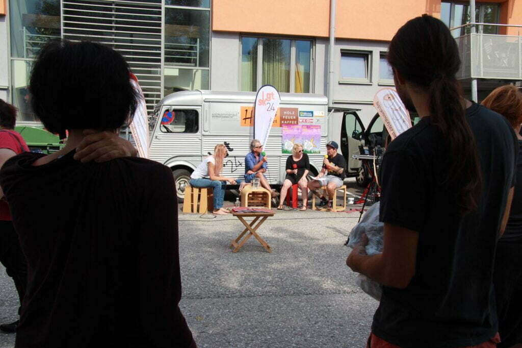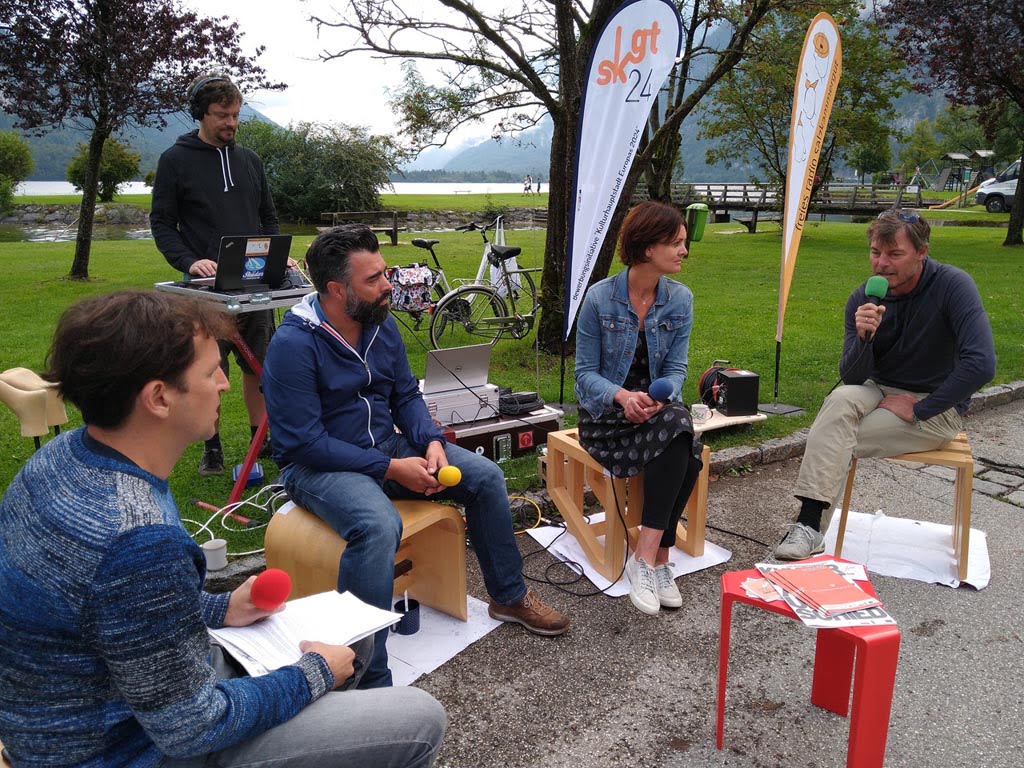 Einen Teil unserer Mobile Office Tour haben wir mit dem Freies Radio Salzkammergut gestaltet. Gemeinsam fuhren wir auf die Wochenmärkte der Region, um dort mit wechselnden Gästen über ortsspezifische Themen zu diskutieren. Die Gespräche würden live im Radio übertragen und boten für Passant*innen die Möglichkeit, Kommentare oder Fragen an die Runde zu adressieren.
