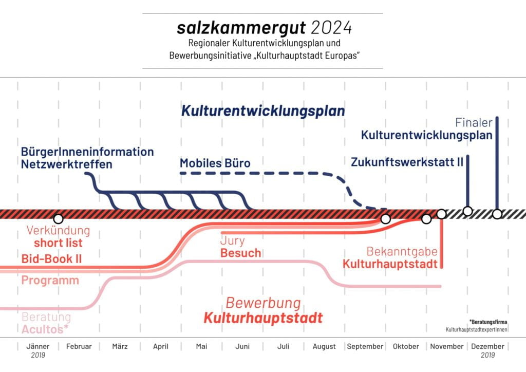 Bis Herbst 2019 durften wir unser zweites und finales Bidbook ausarbeiten. Parallel dazu bereiteten wir den Besuch der internationalen Kulturhauptstadt-Jury am 8. November 2019 im Salzkammergut vor. Dieses Mal standen Details zur Umsetzung, konkrete Pläne und ein weiterentwickeltes Programm im Vordergrund.
