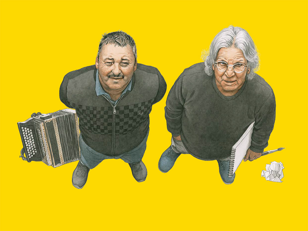 Two people who express their attitude, their spirit of resistance, their love for people and their occasional amazement at them in their art: One draws and paints, the other sings and plays his accordion.