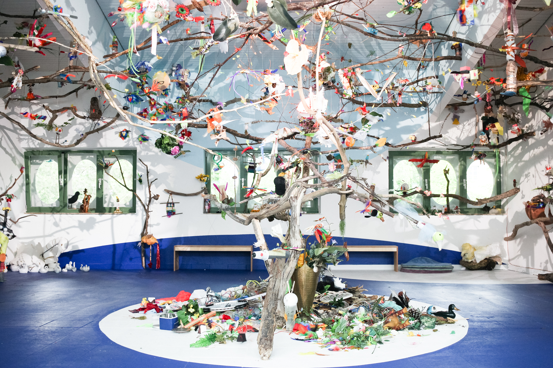 The former restaurant is transformed into a hub of anarchic ornithological diversity. Its final appearance remains uncertain. There is great curiosity about the unbridled inspirations of its visitors. A vibrant, interactive installation created from an extensive selection of found materials, inviting wonder and encouraging experimentation. Those who want birds need courage for the wild.