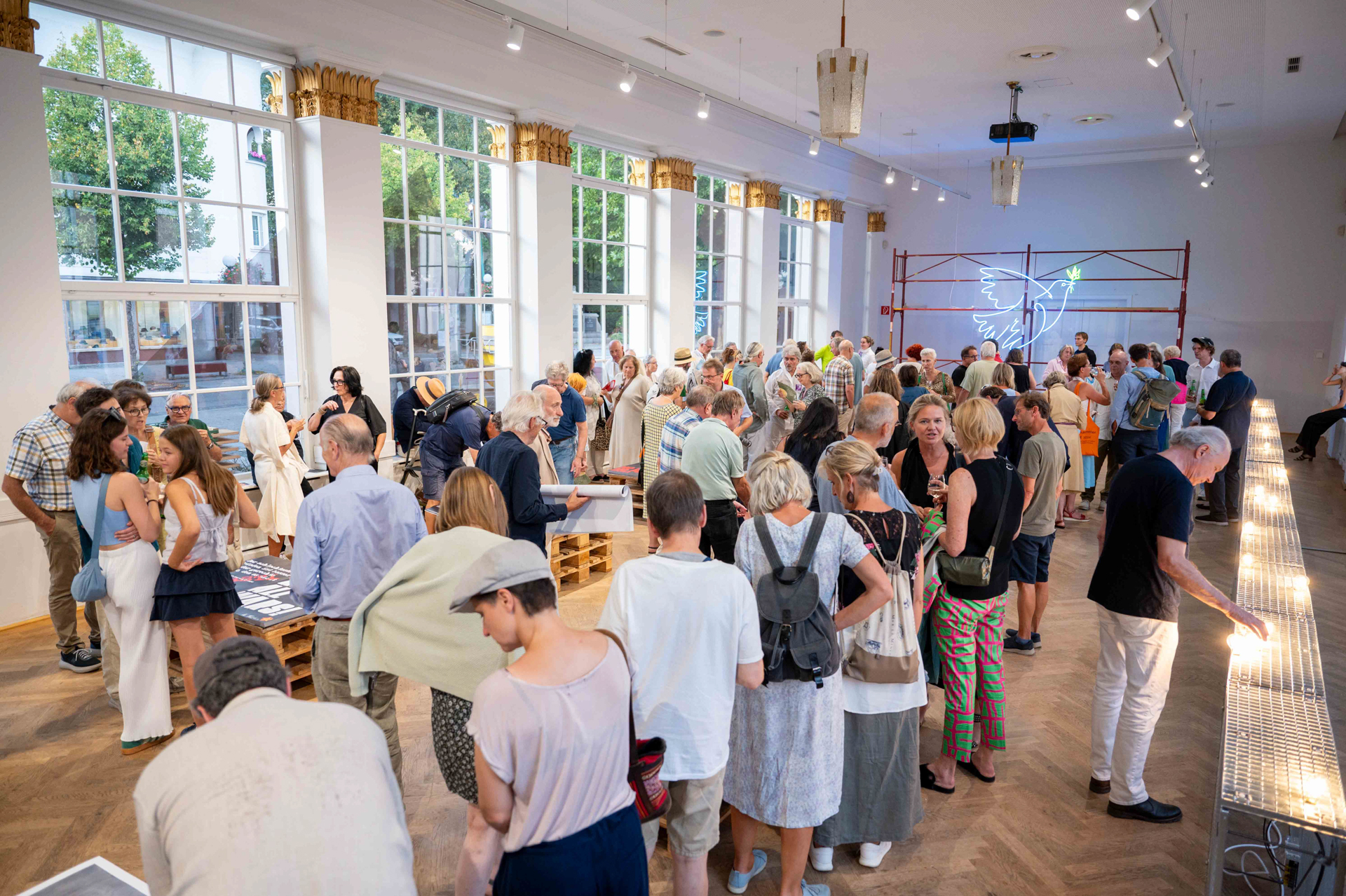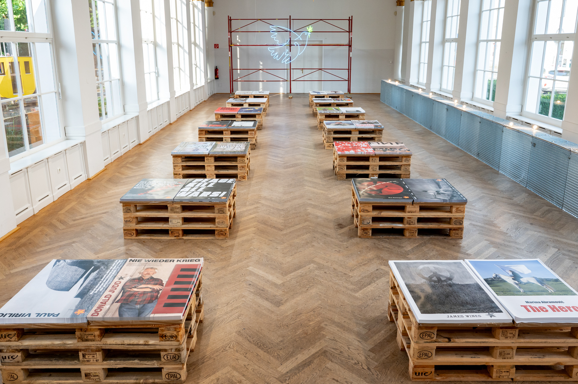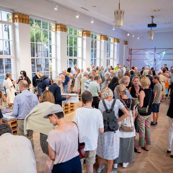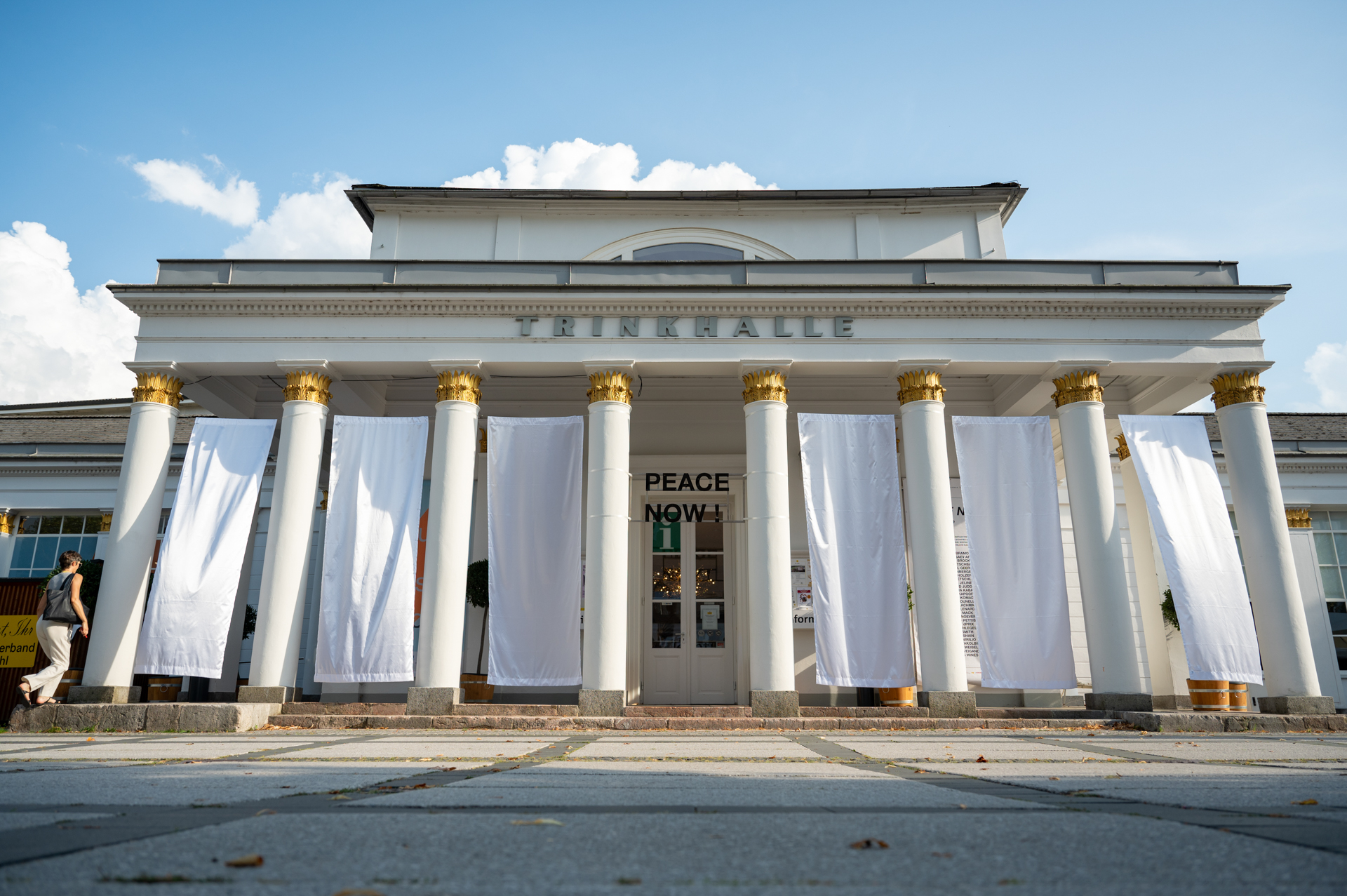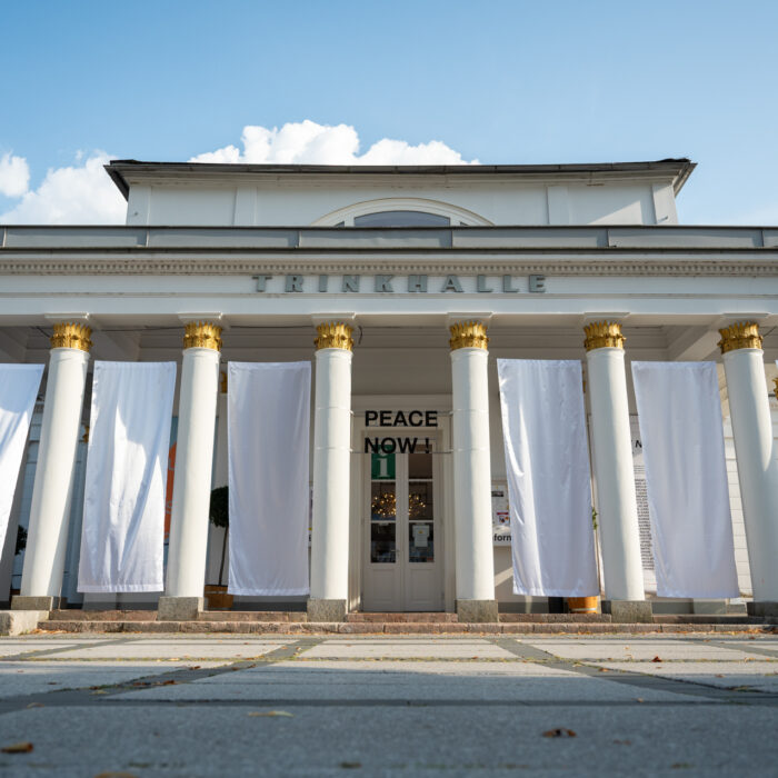 The expansive installation by exhibition organiser Peter Noever in the Trinkhalle Bad Ischl presents 28 positions / manifestos on the theme of peace with artworks / posters specially designed for the exhibition, which are available in a limited edition and were provided free of charge by the artists. The intention of the exhibition Peace Now! – The Artist’s Voice is to open up a forum, a platform, a space for artists for a moment. A space for free thinking, as well as for alternative points of view. 28 stations, 28 art posters open up the opportunity to take selected positions with you and pass them on. The “dove of peace” specially produced as a neon object and the peace flag on the Trinkhalle once again emphasise the claim of this extremely topical and important initiative.
