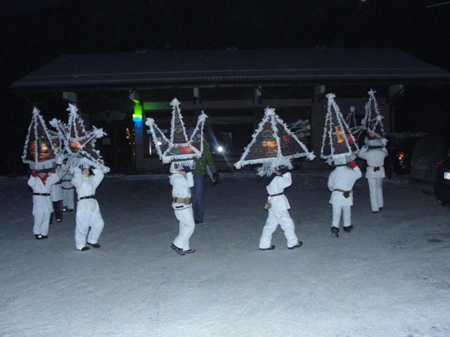 Afterwards the Glöckler, divided into three groups, run through the whole village wishing the population a happy new year. The Glöckler are invited to rest in various guesthouses and private houses and provided with warming tea and a good snacks.