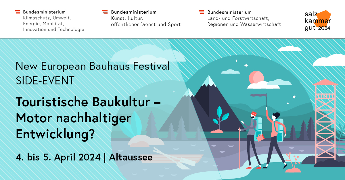 For “Salzkammergut 2024”, too, the question arises as to what form and “face” sustainable tourism could take in the future and what development would be desirable for all those involved. In this context, the event “Touristic building culture – motor of sustainable development” is intended to examine the role that tourist building culture can play in this development. The leitmotif triad of the New European Bauhaus – sustainability, aesthetics and inclusion – will serve as a framework.
