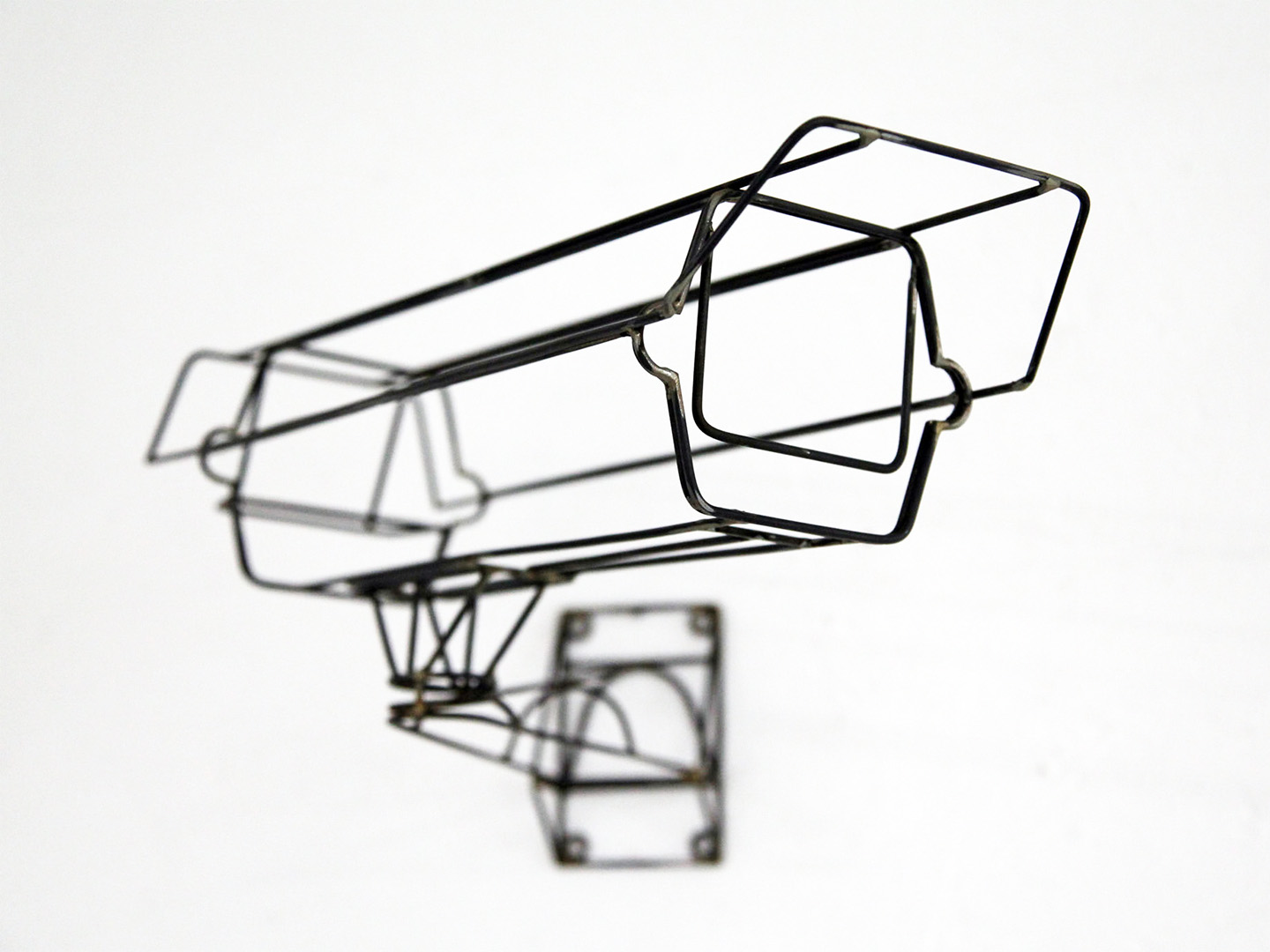 In his temporary workshop at the railway station, he creates a series of surveillance cameras as wire objects, which he presents in the former stationmaster’s office. As in previous residencies, the artist immerses himself intensively in his work. The surveillance cameras arouse his interest for reasons of both content and form. Through the large number of lenses focussed on the visitors, the artist intensifies the effect and evokes a feeling of distress. This is intensified by a sound installation by Rupert Derschmidt, which distributes the noise produced by the devices when swivelling and focussing throughout the room. Visitors are exposed to the sight and sound of the cameras throughout the room.