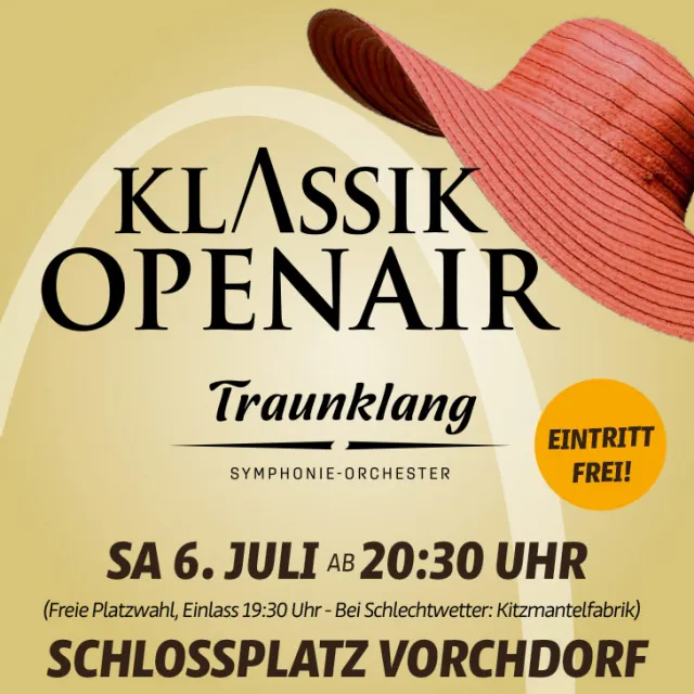 The Traunklang Symphony Orchestra Upper Austria under the direction of Christian Radner will be giving a free concert that evening. Musical delicacies from Johann Strauss to well-known melodies from film and dance can be heard.Soprano: Bernadette Steininger, soloists: Marina Stürzlinger and Gerhard Mair.