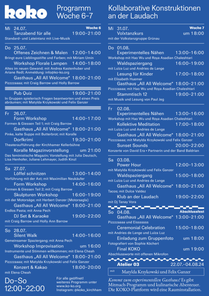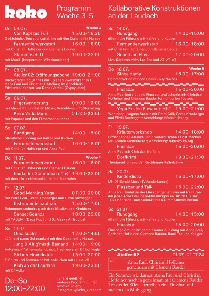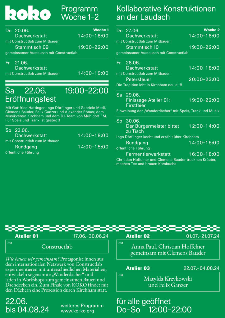 KOKO (Kollaborative Konstruktionen) entwickelt einen prototypischen Ort des Gemeinschaffens und lädt zur Teilhabe am kollaborativen Arbeitsprozess ein. Im Dialog und Austausch zwischen der Bevölkerung und Akteur:innen vor Ort sowie lokalen, regionalen und internationalen Künstler:innen als auch Besucher:innen entsteht ein lebendiger Treffpunkt mit vielseitigem Programm wie Interventionen, Ausstellungen, Performances, Workshops und Diskussionen.