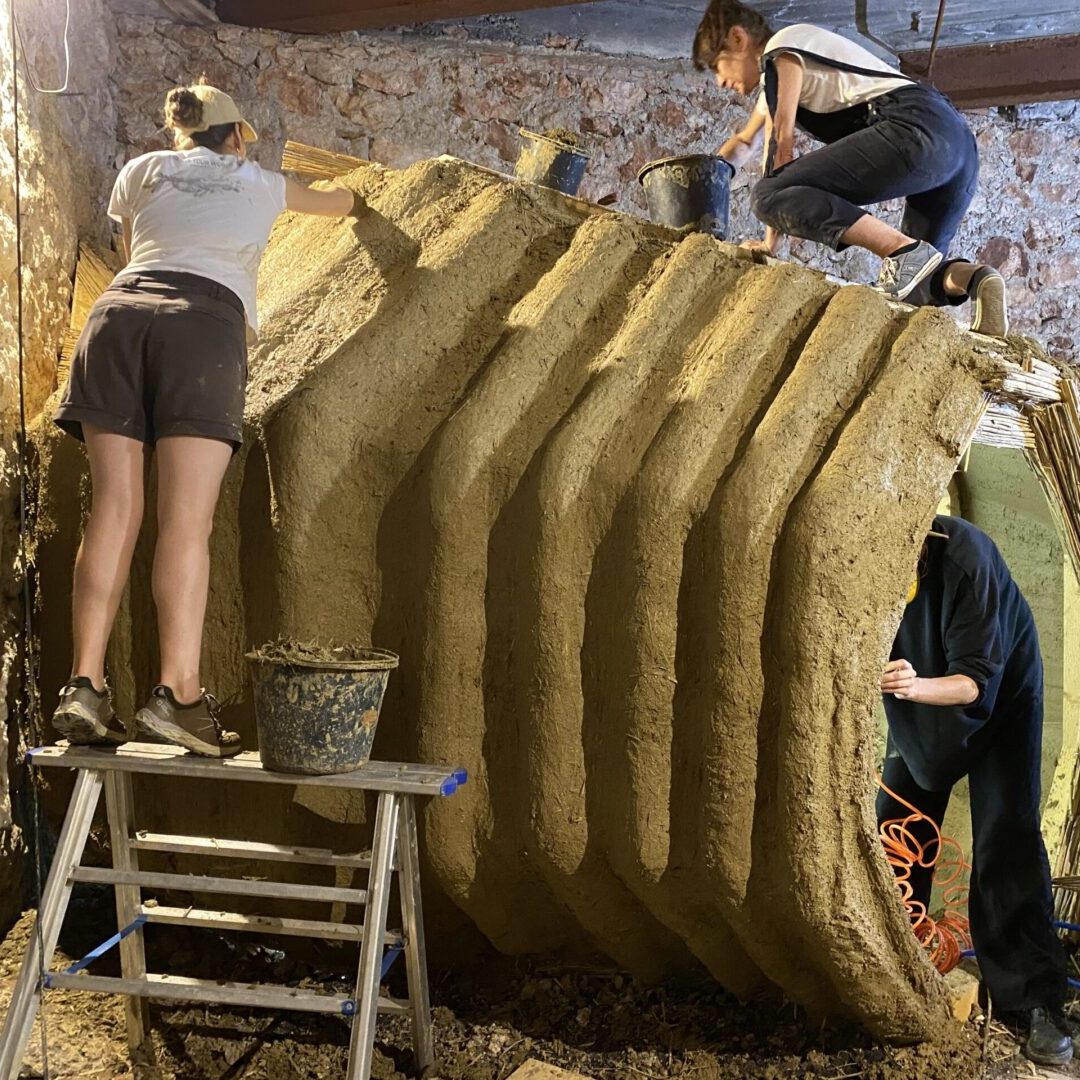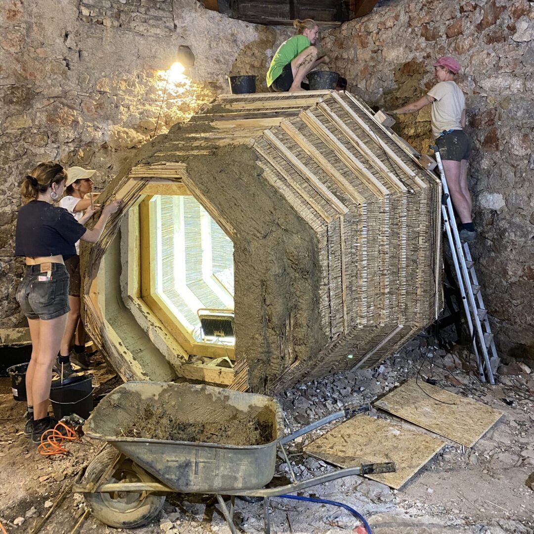 Vom 19. bis 21. Juli werden jeweils von 9 bis 17 Uhr Timeslots für 15 Teilnehmer:innen pro Tag vergeben. Anton Auer, Lehmbauer und Workshopleiter, und die projekttragenden Künstler:innen Josseline Engeler, Ruth Größwang und Robert Angerer werden mit den Besucher:innen gemeinsam das Material das N.E.S.T. mit einer COB-Mischung aus Lehm, Sand und Stroh bauen. Die Vorbereitung der tragenden Konstruktion aus Holz, das Aufbereiten des Materials und das eigentliche Verputzen der Trägerkonstruktion werden professionell vermittelt. Das N.E.S.T. ist sowohl Vermittlungsort, als auch Rauminstallation. Es ist Handwerk am Kunstwerk. Eine künstlerische Forschungsstation, deren experimenteller und symbiotischer Charakter im Vordergrund steht.