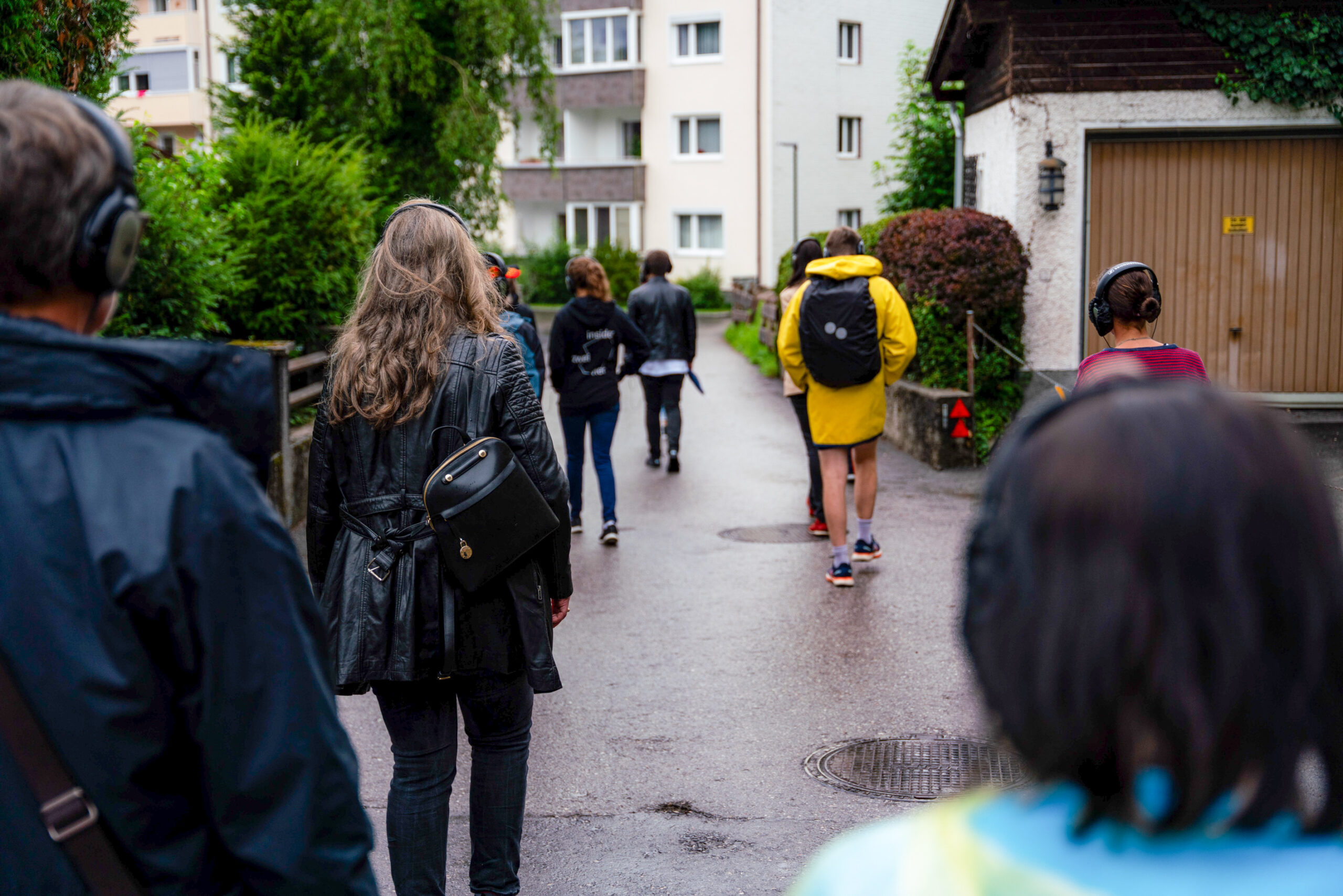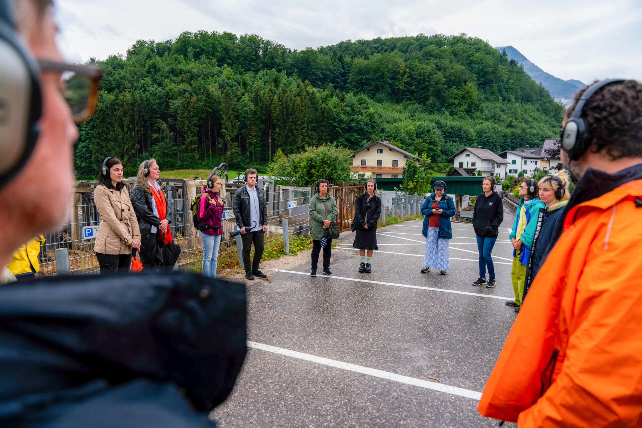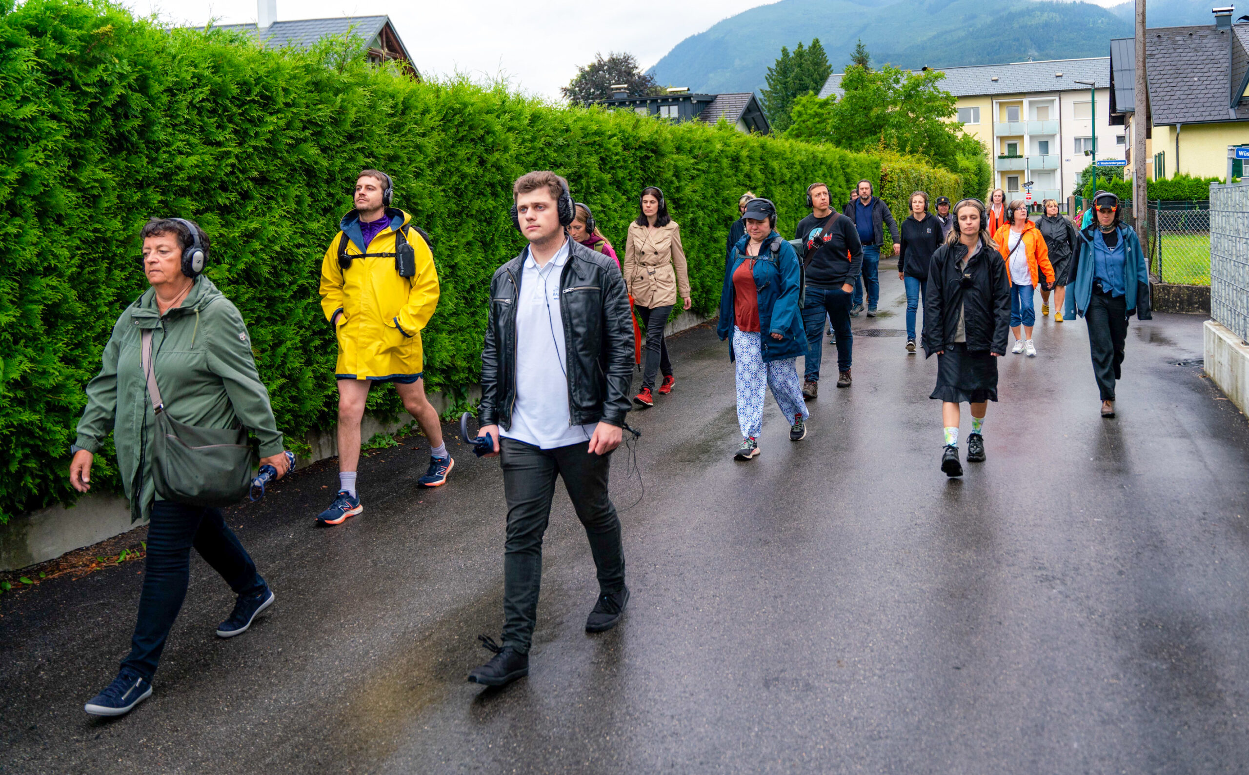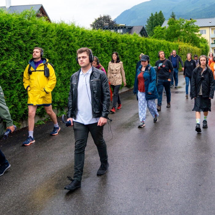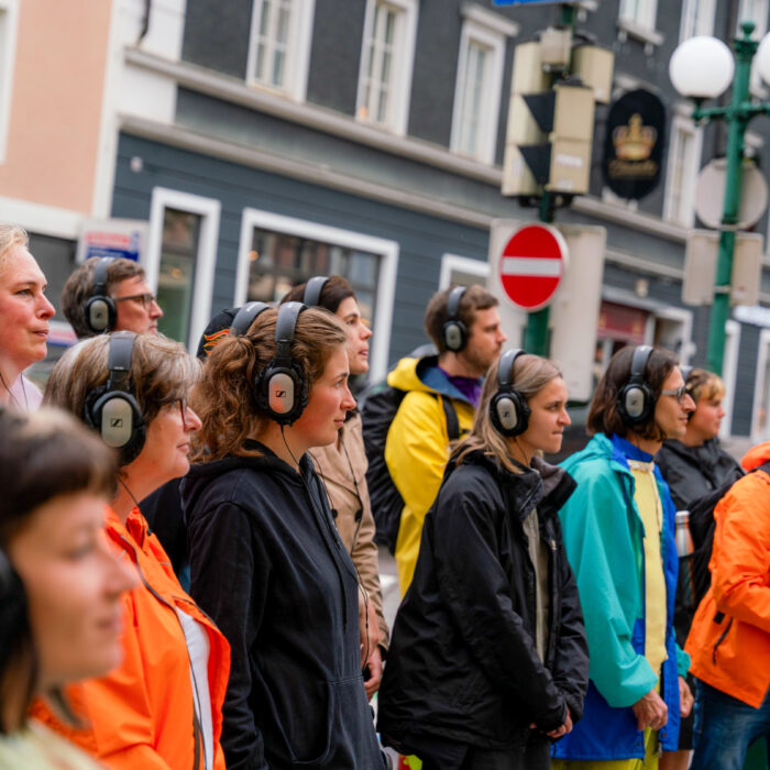 In Bad Ischl bricht eine Gruppe von bis zu 30 Menschen, ausgestattet mit Kopfhörern, in die Stadt auf. Geleitet werden sie von einer künstlichen Stimme, wie man sie von Navigations-Systemen kennt. Die Begegnung mit der Künstlichen Intelligenz verleitet die Gruppe zum Selbstversuch. Wie können wir gemeinsam Entscheidungen treffen? Wem folgen wir, wenn wir uns von einem Computerprogramm leiten lassen? – 30 Menschen beobachten sich gegenseitig, treffen individuelle Entscheidungen und sind doch immer Teil einer Gruppe. Während die Künstliche Intelligenz menschliches Verhalten aus der Distanz beobachtet, wird die Stimme mit jedem Schritt vertrauter. Unterwegs vertonen Kunstkopf-Aufnahmen und filmische Kompositionen die urbane Landschaft. Die Reise durch die Stadt fühlt sich mehr und mehr an wie ein kollektiver Film. Das Projekt bewegt sich als mobiles Forschungslabor von Stadt zu Stadt. Dabei baut jede neue ortsspezifische Version auf der Dramaturgie der Vor-Stadt auf und schreibt das Stück so immer weiter. – Das Stück beschäftigt sich mit traditionsreichen Orten und Begebenheiten in Bad Ischl.