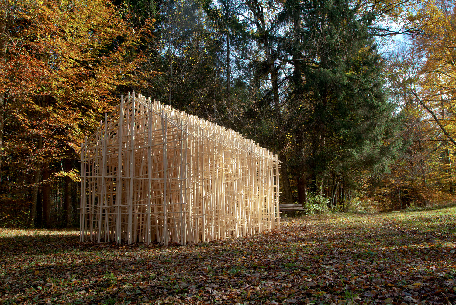 Ein Geflecht aus Holzlatten bildet eine Hausform. Die Pflanzen- und Tierwelt kann in dieses Haus einziehen. Mit der Zeit wird das Holz verwittern, die Natur wird sich seiner bemächtigen. Die Menschen von St. Konrad bestimmen, ob oder ab welchem Verwitterungsgrad diese Skulptur wieder entfernt werden soll.