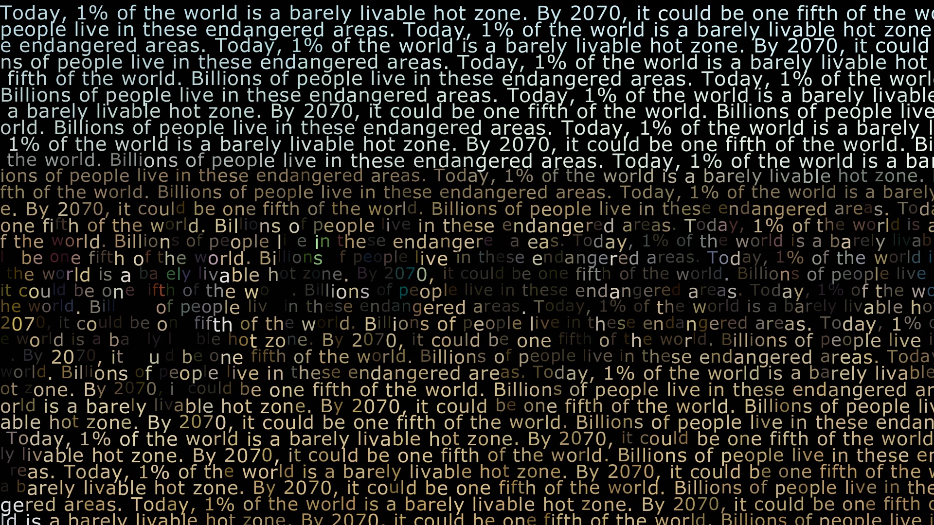 In „Flood“ verschränken sich Text und Bild: Aus den Buchstaben und Wörtern, die sowohl die gültige Fassung der Menschenrechte als auch ihre in Hinblick auf den Klimawandel virulentesten Erweiterungen formen, schälen sich bewegte Bilder von Landschaften, von Wasser, aber auch von den Konsequenzen des Raubbaus an der Erde und ihrem Klima.