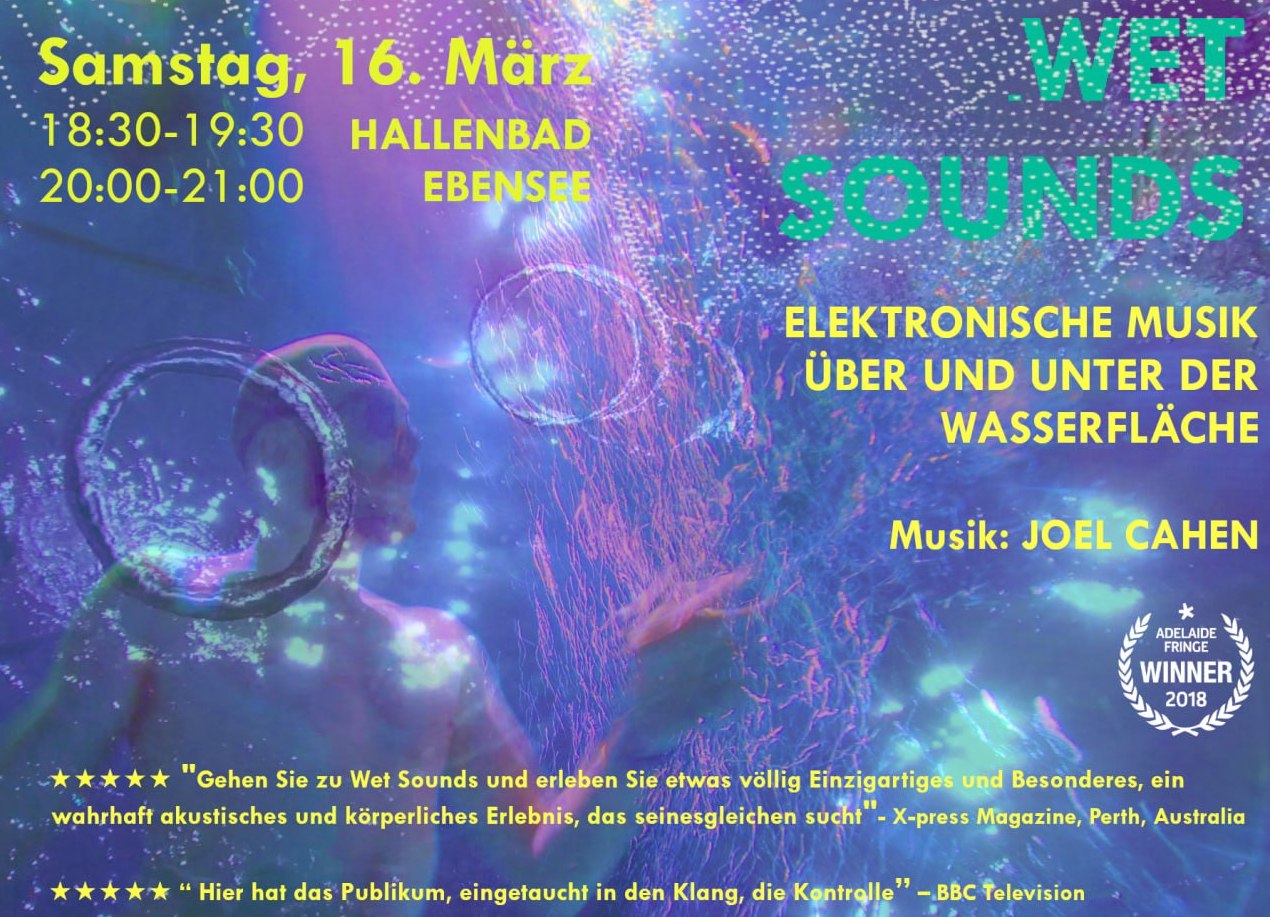 Ein Hörerlebnis, das alle Sinne berührt: „Wet Sounds“ lassen auf der Wasseroberfläche schweben und Entspannung und Wohlbefinden generieren. Als Wasserwesen besteht unser Körper bis zu 70 % aus Wasser. Eine musikalische Reise ins eigene Innere. Diese Eigenschaft lässt uns im Wasser jene Schwerelosigkeit wiedererfahren. Mit einer sanften Collage aus elektronischer Musik, akustischen Instrumenten und Aufnahmen des Komponisten werden auf sanfte Art einzigartige Erfahrungen durch feine Vibration erlebt.